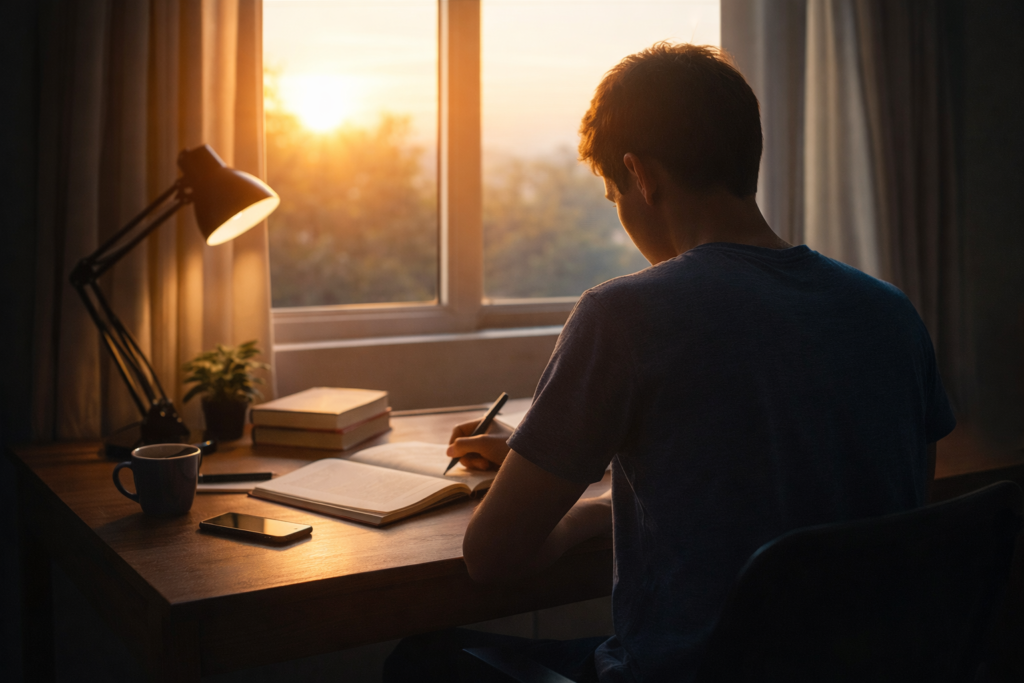 Student studying early morning showing the power of self discipline and focus for achieving success.